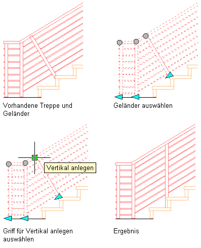 Nachdem Sie die vertikale Ausrichtung für den Geländerpfosten festgelegt haben, wird der Griff Vertikal anlegen zu einem Griff Lotrecht anlegen. Wählen Sie den Griff Lotrecht anlegen, um zu einer lotrechten Ausrichtung des Pfostens zurückzukehren.