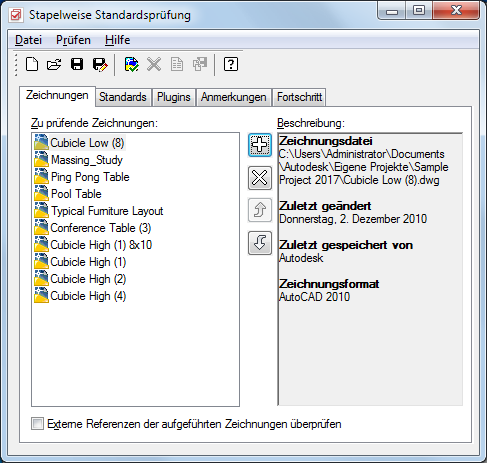 Die stapelweise Standardsprüfung für AutoCAD wird unabhängig von AutoCAD Architecture toolset ausgeführt.