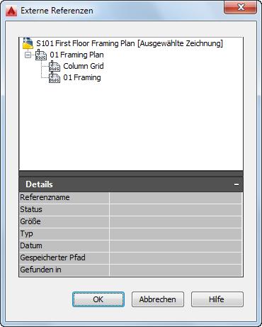 Anmerkung: Sie können die externen Referenzen einer Planzeichnung auch anzeigen, indem Sie diese öffnen und den AutoCAD XRef-Manager verwenden.