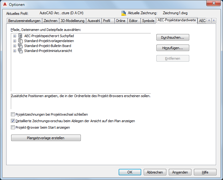 | Festlegen, dass der Projekt-Browser bei jedem Öffnen von AutoCAD Architecture toolset angezeigt wird | Aktivieren Sie Projekt-Browser beim Start anzeigen. |