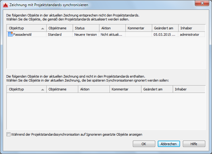 In diesem Fall bleibt die nicht standardmäßige Version bei dieser Synchronisation im Projekt erhalten, wird also nicht aktualisiert. Wenn die Zeichnung das nächste Mal synchronisiert wird, wird der Stil bzw. die Anzeigeeinstellung erneut als ältere oder nicht standardmäßige Version angezeigt.