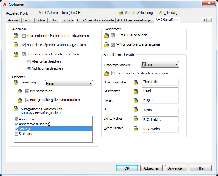 Zu den Einstellungen für AEC-Bemaßungen zählen: