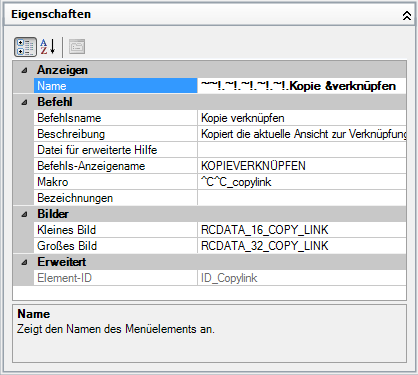 Die Tilde (~) und das Ausrufezeichen, gefolgt von einem Punkt (!.) werden vor die Befehlsbeschriftung Kopie verknüpfen (Eigenschaft Name des Bereichs Eigenschaften) gesetzt. Es folgt eine Darstellung des Befehls Kopie verknüpfen, der im Menü Bearbeiten markiert und grau abgeblendet ist.