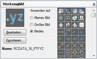 Anmerkung: Klicken Sie auf Importieren, um eine auf einem lokalen Netzlaufwerk gespeicherte Bilddatei zu importieren, um sie im Dialogfeld Werkzeugeditor zu bearbeiten und in der Arbeits-CUIx-Datei zu speichern.