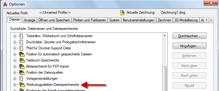 Werkzeugpalettendateien enthalten standardmäßige und benutzerdefinierte Werkzeuge. Die Dateien sind an den Speicherorten abgelegt, die von der Einstellung Werkzeugpaletten-Dateispeicherorte angegeben werden.
