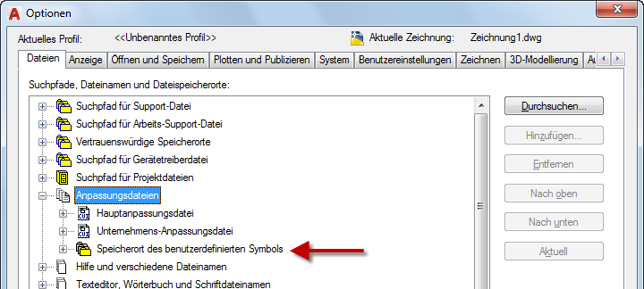 Benutzerprofile umfassen auch die Speicherorte, in denen das Programm nach Support-, Treiber-, Anpassungsdateien und anderen Dateien sucht. Wenn Ihre benutzerdefinierten Dateien nicht an den vorgabemäßigen Speicherorten abgelegt sind, werden die Pfade zu diesen Speicherorten migriert, die benutzerdefinierten Dateien selbst jedoch nicht. Migrieren Sie Ihre benutzerdefinierten Dateien mit den Optionen im Dienstprogramm Benutzerdefinierte Einstellungen migrieren, oder kopieren Sie die Dateien manuell zwischen den Speicherorten der früheren und der aktuellen Version des Programms.