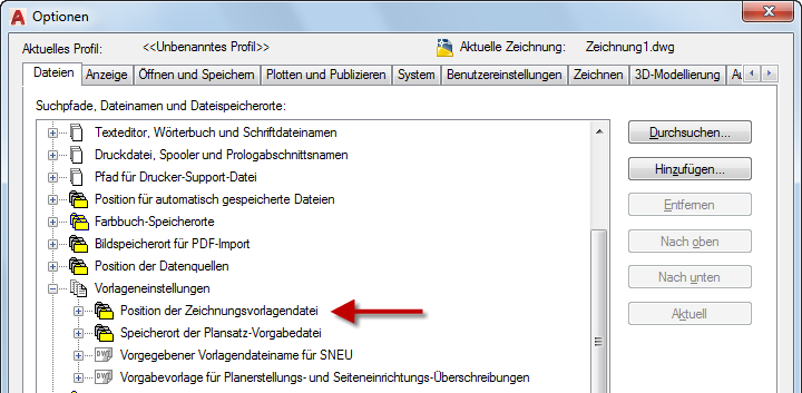 Zeichnungsvorlagendatei (DWT) werden zum Erstellen neuer Zeichnungen verwendet. Die anhand einer DWT-Datei erstellten Zeichnungen enthalten alle Stile und Zeichnungsobjekte, die in der DWT-Datei definiert sind. Die benutzerdefinierten DWT-Dateien aus der früheren Version werden in einen Unterordner mit dem Namen der Zielversion migriert; die Namenskonvention des Unterordners lautet Produktname Templates. Der Unterordner Produktname Templates wird unter dem Ordner erstellt, der in der Einstellung Position der Zeichnungsvorlagendatei definiert ist.