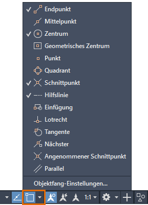 3. Klicken Sie auf den Pfeil, oder klicken Sie mit der rechten Maustaste auf das Objektfang-Symbol, um das zugehörige Kontextmenü einzublenden.