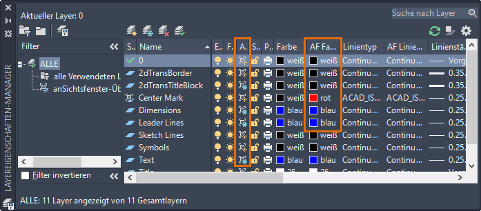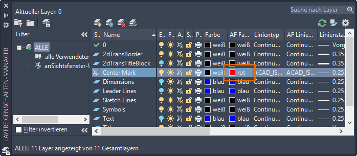 2. Ändern Sie die Farbe des Layers Mittelpunktmarkierung in Rot. Um sicherzustellen, dass die Farbänderung nur für dieses Ansichtsfenster erfolgt, wählen Sie die Farbe in der Spalte AF Farbe aus.