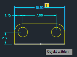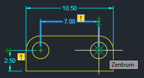 Die gelben Markierungen weisen beispielsweise darauf hin, dass diese Zeichnung über zwei Bemaßungen verfügt, die nicht mit der von ihnen bemaßten Geometrie verknüpft sind.