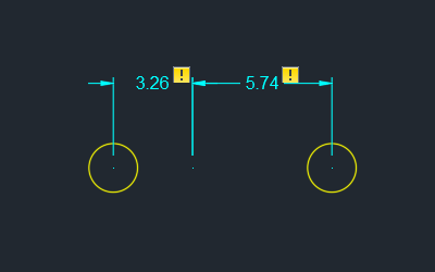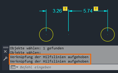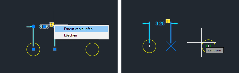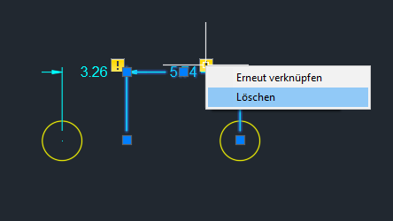 Eine gelbe Markierung wird auf den Bemaßungen angezeigt, die angibt, dass sie nicht mehr mit den Kreisen verknüpft sind. Durch das Löschen des mittleren Kreises sind zwei nicht mehr verknüpfte Bemaßungen vorhanden.