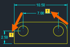 Wenn die Beschriftungsüberwachung aktiviert ist, wird eine gelbe Markierung auf den Bemaßungen angezeigt, deren Assoziativität verloren gegangen ist. Häufige Ursachen für den Verlust der Assoziativität sind gelöschte oder erheblich geänderte Geometrien, nicht unbedingt das Verschieben oder Ändern der Größe von Geometrie.