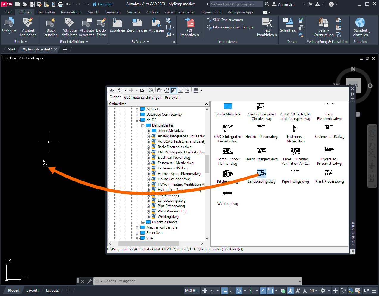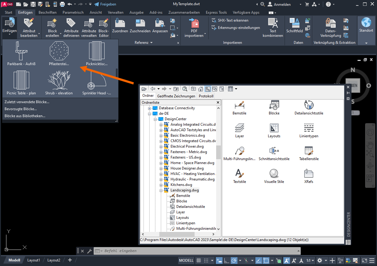 Die in Landscaping.dwg definierten benannten Stile, Blöcke und Zeichnungseinstellungen stehen nun in MyTemplate zur Verfügung.