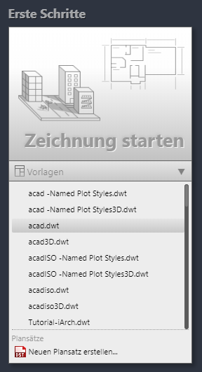 Autodesk stellt mit der Installation von AutoCAD mehrere Vorlagen bereit. Auf diese Vorlagen können Sie über die Registerkarte Start in der Dropdown-Liste Vorlagen zugreifen.