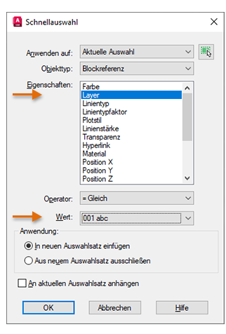Zurzeit sind alle Blöcke auf Layer 001 abc ausgewählt. Beachten Sie, dass das Feld Anwenden auf automatisch zu Aktuelle Auswahl gewechselt ist, wie unten gezeigt.