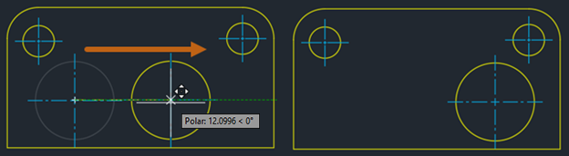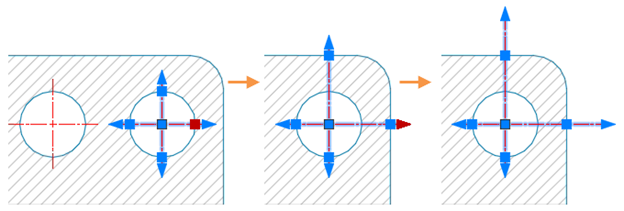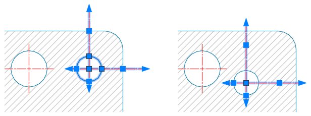 Mittelpunktmarkierungen und Mittellinien sind vorgabemäßig assoziativ. Wenn Sie das verknüpfte Objekt ändern oder verschieben, werden die Mittelpunktmarkierungen und Mittellinien, die mit den Objekten verknüpft sind, entsprechend angepasst.