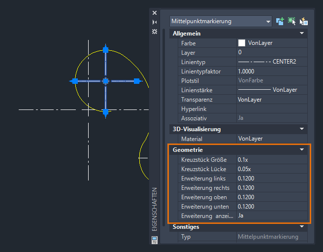 Eigenschaften können auch über die Eigenschaftenpalette geändert werden. Wählen Sie bei angezeigter Eigenschaftenpalette eine Mittelpunktmarkierung oder eine Mittellinie aus, und ändern Sie die Eigenschaften wie Farbe, Kreuzstück Größe, Kreuzstück Lücke, Länge der Verlängerung usw.