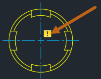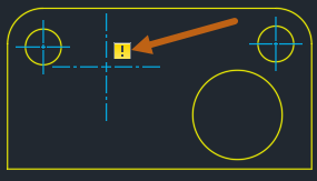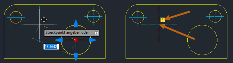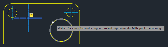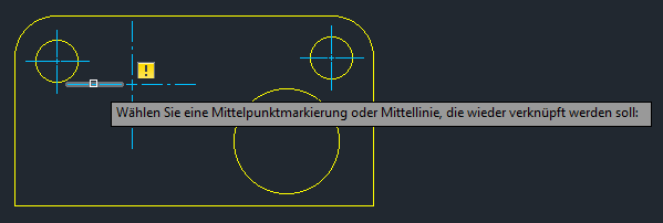 Mittelpunktmarkierungen und Mittellinien verfügen teilweise über dieselben assoziativen Eigenschaften wie Bemaßungen. Die Verknüpfung kann aufgehoben werden, wenn die von ihnen gemessene Geometrie gelöscht wird. Wenn die Verknüpfung einer Mittelpunktmarkierung oder Mittellinie aufgehoben wird und die Beschriftungsüberwachung aktiv ist, wird wie bei einer Bemaßung eine gelbe Markierung neben der Mittelpunktmarkierung oder Mittellinie angezeigt.
