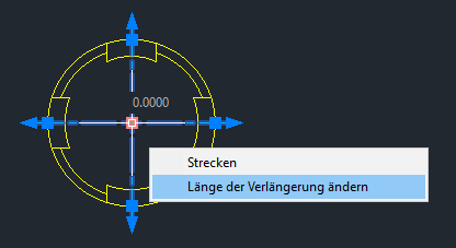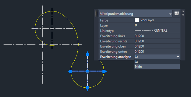 Wenn Sie den Mauszeiger über den multifunktionalen Mittelpunktgriff einer Mittelpunktmarkierung bewegen, wird ein Menü angezeigt. Hier können Sie verlängern, um die Mittelpunktmarkierung zu verschieben und die Länge aller vier Hilfslinien von Mittellinien einheitlich zu ändern.