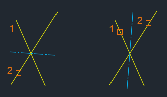 Bei sich schneidenden Linien halbiert die Mittellinie die Winkel der beiden sich schneidenden Linien. Im folgenden Beispiel definiert die Position der Auswahlpunkte die Richtung der Mittellinie.