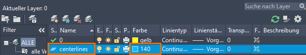 Wenn eine Mittellinie oder Mittelpunktmarkierung erstellt wird, wird sie unabhängig vom aktuellen Layer auf dem Layer Mittellinien platziert.