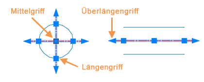 Griffe ermöglichen die Direktbearbeitung von Mittelpunktmarkierungen und Mittellinien. In diesem Beispiel wurden die Mittellinien einzeln geändert. Wenn Sie einen Längengriff ziehen, wird die Länge der Mittellinie verändert, und die Hilfslinie der Mittellinie wird ebenfalls entsprechend verschoben. Durch Ziehen des Überlängengriffs wird nur die Hilfslinie der Mittellinie geändert.