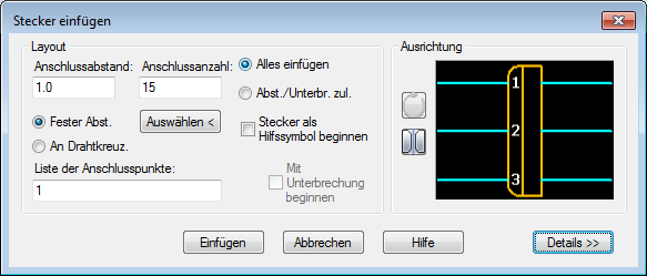 Mit dem Werkzeug Stecker einfügen wird ein Steckersymbol aus benutzerdefinierten Parametern erzeugt. Das Symbol wird unmittelbar erstellt und als eine Blockeinfügung in die aktive Zeichnungsdatei eingefügt. Da die Erstellung nach Bedarf erfolgt, müssen Sie keine Bibliothek mit Steckersymbolen erstellen oder pflegen.