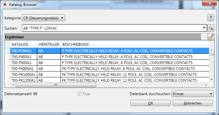 Die ausgewählte Herstellerbezeichnung und die ausgewählte Katalognummer werden im Dialogfeld Betriebsmittel einfügen/bearbeiten angezeigt. Wenn Sie im Dialogfeld auf OK klicken, werden die Werte auf das Symbol übertragen.