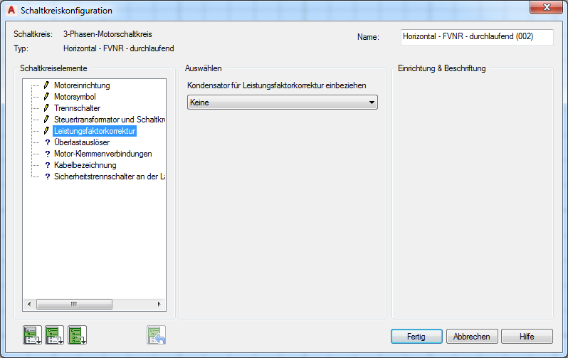Abschnitt Einrichtung & Beschriftung: Die in diesem Abschnitt aufgeführten Optionen ändern sich je nach Auswahl in den Abschnitten Schaltkreiselemente und Auswählen. Geben Sie Werte ein, oder greifen Sie über die Durchsuchen-Schaltfläche auf eine Suchtabelle zu.