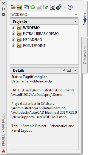 AutoCAD Electrical toolset ist ein projektbasiertes System. Jedes Projekt wird durch eine ASCII-Textdatei mit der Erweiterung .wdp definiert. Diese Projektdatei enthält eine Liste von Projektinformationen, die Standardeinstellungen für das Projekt, die Zeichnungseigenschaften und die Namen der Zeichnungsdateien. Sie können eine beliebige Anzahl von Projekten erstellen. Es kann jedoch immer nur ein Projekt aktiv sein.