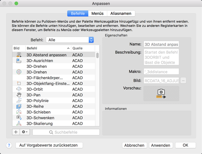 Zeigt das dem Befehl zugeordnete Makro an. Geben Sie ein neues Makro ein oder ändern Sie das vorhandene Makro für den Befehl.