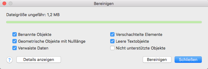 Nicht unterstützte Objekte sind benutzerdefinierte Objekte oder Daten, die von AutoCAD for Mac nicht unterstützt werden. Wenn Sie Nicht unterstützte Objekte ausgewählt haben, wird das Dialogfeld Nicht unterstützte Objekte angezeigt, nachdem Sie auf Bereinigen geklickt haben. Wählen Sie in der Liste die Objekte aus, die Sie bereinigen möchten. Beim Bereinigen nicht unterstützter Objekte kann es zu einem Datenverlust kommen. Prüfen Sie sorgfältig die Liste der nicht unterstützten Objekte.