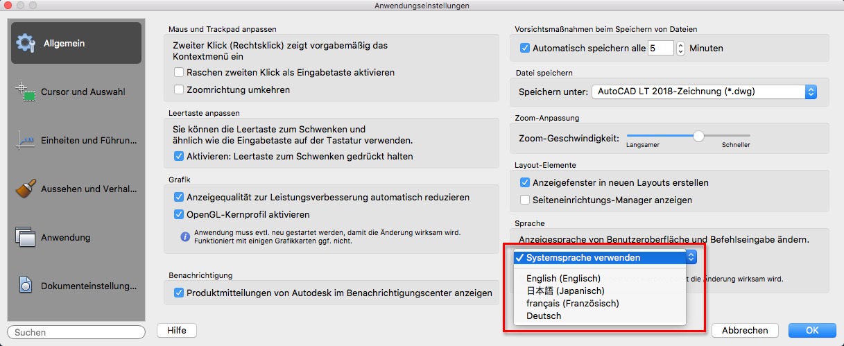 AutoCAD LT for Mac unterstützt jetzt Deutsch und Japanisch. Sie können die Sprache im Dialogfeld Anwendungseinstellungen ändern. Starten Sie AutoCAD LT for Mac neu, damit die Sprache geändert wird.