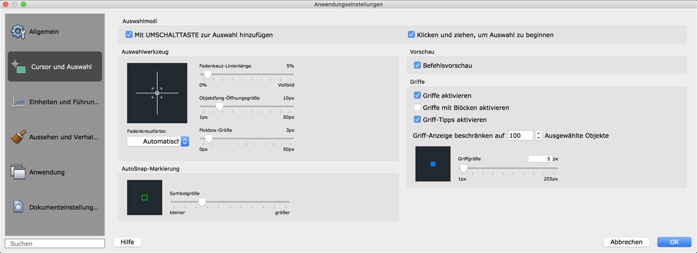 Steuert die Farbe von Fadenkreuz, Objektfang-Öffnung und Pickbox im Zeichenbereich. Automatisch ist die Vorgabefarbe.