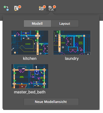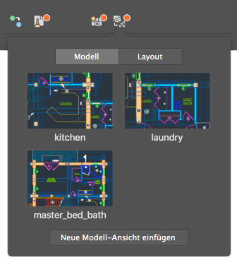 Wenn der Modellbereich aktiv ist, wird bei Auswahl einer benannten Ansicht zu dieser Ansicht gewechselt. Klicken Sie auf Neue Modellansicht, um eine Ansicht zu erstellen und dem Ansichtskatalog hinzuzufügen.