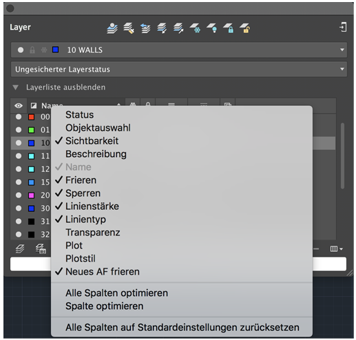 Führt die Namen aller Spalten auf. Ein Häkchen gibt an, dass die Spalte angezeigt wird. Klicken Sie zum Anzeigen oder Ausblenden der Spalte auf einen Spaltennamen. AF Frieren, AF Farbe, AF Linientyp, AF Linienstärke und AF Plotstil sind nur verfügbar, wenn ein Layout-Ansichtsfenster aktiv ist.
