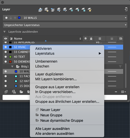 Aktiviert bzw. deaktiviert die folgenden Status der ausgewählten Layer: Frieren in neuen Ansichtsfenstern oder Drucken. Die Option Isolieren isoliert die ausgewählten Layer in der Zeichnung. Alle Layer außer den ausgewählten werden deaktiviert und gesperrt. (siehe Befehl LAYISO)