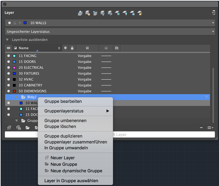 Zeigt eine Liste der Layer in der Zeichnung sowie ihre Eigenschaften an. Sie können Layer hinzufügen, löschen, umbenennen, ihre Eigenschaften ändern und die Änderungen in Echtzeit anwenden.