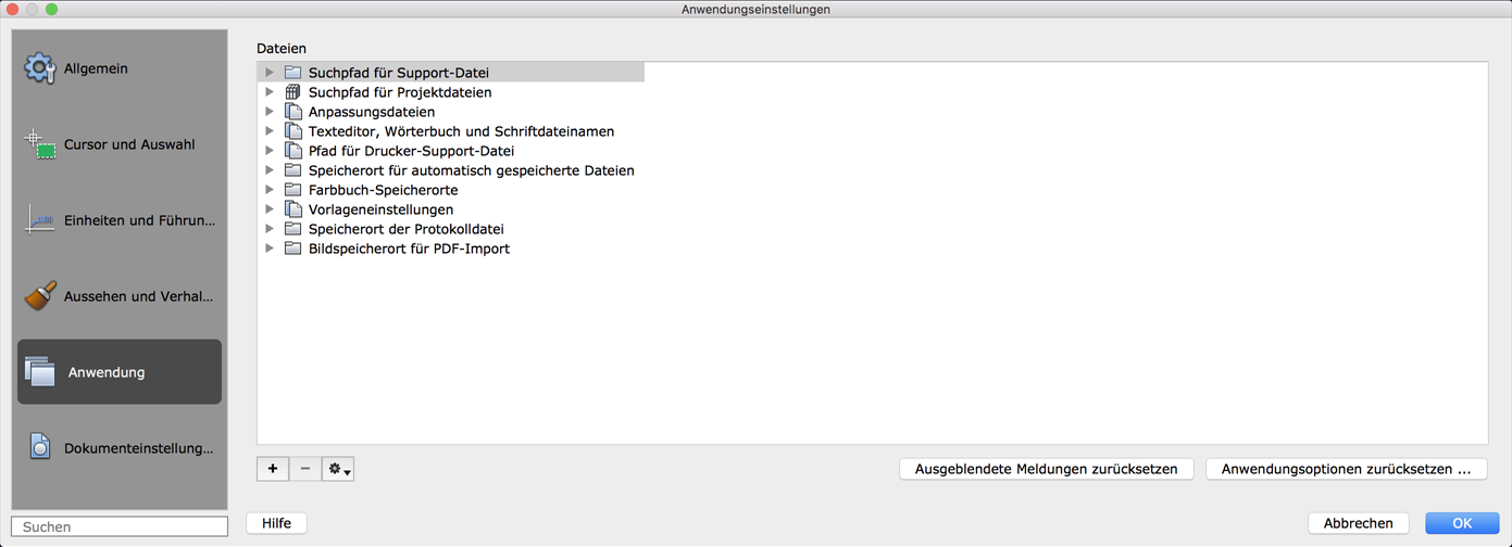 Führt die Ordner auf, in denen das Programm nach Support-, Treiber-, Menü- und anderen Dateien sucht. Darüber hinaus werden einige optionale, benutzerdefinierte Einstellungen aufgeführt, beispielsweise das Wörterbuch für die Rechtschreibprüfung.
