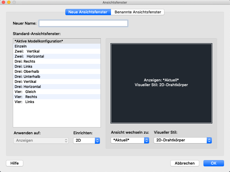 Bestimmt einen Namen für die neu Konfiguration für Ansichtsfenster im Modellbereich. Wenn Sie keinen Namen eingeben, wird die Ansichtsfensterkonfiguration zwar angewandt, jedoch nicht gespeichert. Eine nicht gespeicherte Ansichtsfensterkonfiguration kann nicht für Layouts verwendet werden.