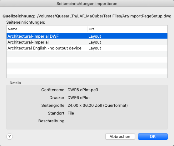 Zeigt die Quellzeichnung an, die eine Liste der für den Import verfügbaren Seiteneinrichtungen enthält.