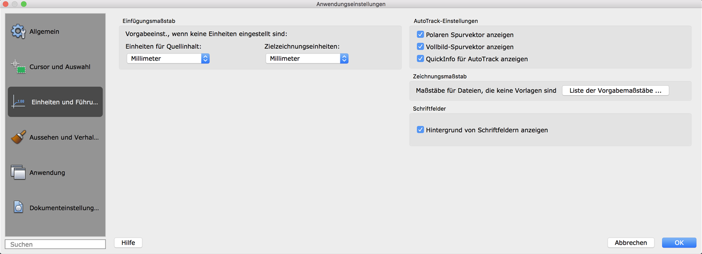 Legt die Einheiten fest, die beim Einfügen von Blöcken oder Referenzieren von Objekten verwendet, und welche Entwurfshilfslinien aktiviert werden.