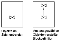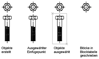 Die Abbildung zeigt eine typische Schrittfolge zum Erstellen einer Blockdefinition in einer Zeichnung.