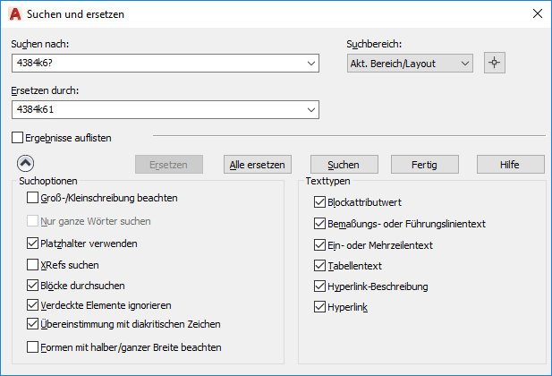 Beispiel: Ihre Zeichnung enthält mehrere ähnliche Bauteile. Wenn Sie sie aber alle in 4384K61 ändern möchten, geben Sie 4384K6? im Feld Suchen nach und 4384k61 im Feld Ersetzen durch ein.