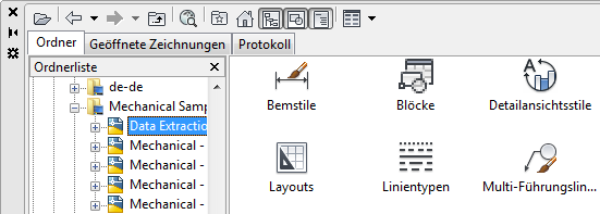 Die Strukturansicht im linken Bereich des DesignCenter-Fensters und die Registerkarten erleichtern das Suchen und Laden von Inhalt in den Inhaltsbereich.