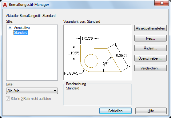 Mit den Elementen unter Liste legen Sie fest, welche Bemaßungsstile angezeigt werden sollen.