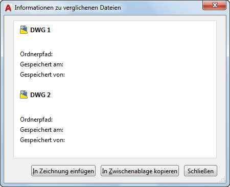 VERGLEICHINFO öffnet das Dialogfeld Zeichnungsinformationen, in dem Sie entweder die Eigenschaftsinformationen der beiden Zeichnungsdateien als Tabelle in Ihre aktuelle Zeichnung einfügen oder die Informationen als Text in die Zwischenablage kopieren können.