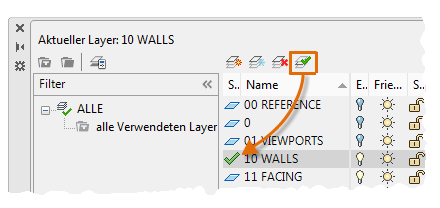 Alle neuen Objekte werden auf dem aktuellen Layer gezeichnet. Das grüne Häkchen im Layereigenschaften-Manager zeigt den aktuellen Layer an.