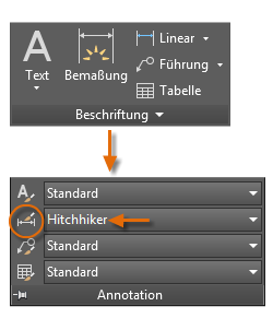 Der Name des aktuellen Bemaßungsstils, in diesem Fall Hitchhiker, wird auch in der Dropdown-Liste der Gruppe Beschriften angezeigt.