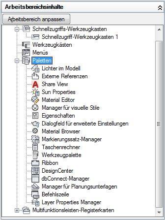- Klicken Sie im Bereich Arbeitsbereichsinhalte auf das Pluszeichen (+) neben dem Knoten Paletten, um ihn zu erweitern.